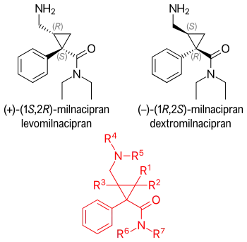 The conformation of milnacipran is an important part of its pharmacophore. Changing its stereochemistry affects the norepinephrine and serotonin concentration. Milnacipran is marketed as a racemic mixture. Effects of milnacipran reside in the (1S,2R)-isomer and substitution of the phenyl group in the (1S,2R)-isomer has negative impact on norepinephrine concentration.[38] Milnacipran has low molecular weight and low lipophilicity. Because of these properties, milnacipran exhibits almost ideal pharmacokinetics in humans such as high bioavailability, low inter-subject variability, limited liver enzyme interaction, moderate tissue distribution and a reasonably long elimination half-life. Milnacipran's lack of drug-drug interactions via cytochrome P450 enzymes is thought to be an attractive feature because many of the central nervous system drugs are highly lipophilic and are mainly eliminated by liver enzymes.[38]