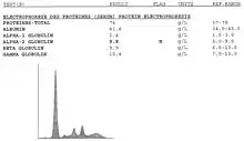 ![]() Normal serum protein electrophoresis diagram with legend of different zones. | |