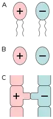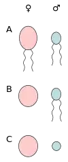 A) anisogamy of motile cells, B) oogamy (egg cell and sperm cell), C) anisogamy of non-motile cells (egg cell and spermatia).