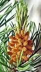 In pines and other conifers, the sex organs are produced within cones that have male and female forms. Male cones are smaller than female ones and produce pollen, which is transported by wind to land in female cones. The larger and longer-lived female cones are typically more durable, and contain ovules within them that develop into seeds after fertilization.