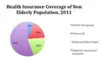 In the United States, the current standard for acquiring health coverage by an individual and their family is through a group plan made available by an employer. As of a 2011 study by the Kaiser Family Foundation, 55.8% of Americans access health[5] coverage through their employer, 20.5% depend on public programs such as Medicaid and Medicare, 5.7% access coverage through a private non-group, and the remaining 18% are uninsured.[6]