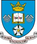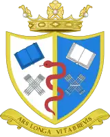 The coat of arms of the Sheffield Faculty of Medicine was granted by the College of Arms on 12 December 2003.[1] It features elements from the coat of arms of the University of Sheffield: the Crown of Success, two sheaves of arrows and the open books, as well as the azure background colour. The rod of Asclepius is centred on the shield.[57] It can be seen throughout the Medical School on its buildings. A variation of the crest is used by various Sheffield Medical Society sports teams.[58]