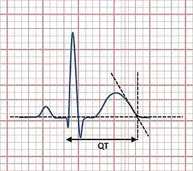 Short QT syndrome (SQT) is a very rare genetic disease of the electrical system of the heart, and is associated with an increased risk of abnormal heart rhythms and sudden cardiac death.[1] The syndrome gets its name from a characteristic feature seen on an electrocardiogram (ECG) – a shortening of the QT interval. It is caused by mutations in genes encoding ion channels that shorten the cardiac action potential, and appears to be inherited in an autosomal dominant pattern.[1] The condition is diagnosed using a 12-lead ECG.[2] Short QT syndrome can be treated using an implantable cardioverter-defibrillator or medications including quinidine.[3] Short QT syndrome was first described in 2000,[4] and the first genetic mutation associated with the condition was identified in 2004.[5]