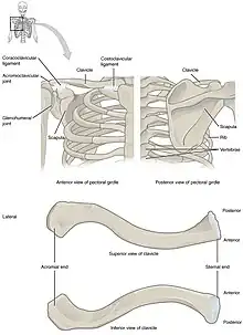 The shoulder girdle or pectoral girdle is the set of bones in the appendicular skeleton which connects to the arm on each side. In humans it consists of the clavicle and scapula; in those species with three bones in the shoulder, it consists of the clavicle, scapula, and coracoid. Some mammalian species (such as the dog and the horse) have only the scapula.
