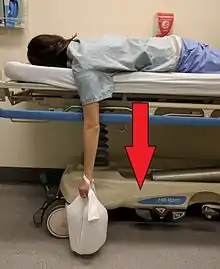 In the Stimson technique, also known as prone technique, the person lies on their stomach on a bed or bench and the arm hangs off the side, being allowed to drop toward the ground. A 5–10 kg weight is suspended from the wrist to overcome spasm and to permit reduction by the force of gravity;[3]