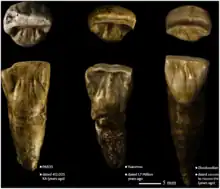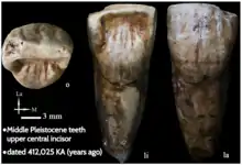 Shovel-shaped dental characteristic are also observed in Homo erectus like the Peking Man and in Neanderthals, although the morphology of these shoveled incisors is distinct from the modern human form of shoveling.[6][7][8] The morphology of Neanderthal's anterior teeth has been seen as an adaptation to the heavy use of their canines and incisors in processing and chewing food, and the use of their teeth for activities other than feeding.[9]