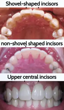 Shovel-shaped incisors are significantly common in Amerindians from North, Central and South America. They are also common in East and Central Asians, Hungarians, the Inuit and Aleut peoples of Northeast Asia and North America (including but not limited to the Inuit peoples of eastern Alaska, arctic Canada and Greenland).[1][2][3][4] In European and African groups, shovel-shaped upper incisors are uncommon or not present.[1] There is a spectrum of the degree of shoveled-ness, ranging on a scale from 0 to 7 of spatulate incisors to shoveled incisors.[1] It was theorized that positive selection for shovel shaped incisors over the spatulate incisors are more commonly found in anthropoids within cultures that used their teeth as tools due to a greater structural strength in increased shovel shaped incisors.[1] However, more modern research suggests that instead genetics plays a role in the degree of shoveled-ness.[5]