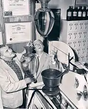 According to Charles Richardson, a collector of pharmaceutical artifacts, two apothecaries arrived in Jamestown, Virginia (1607) shortly after it was founded, and the colonists asked the Virginia Company to send more physicians and apothecaries to the colony.[5] In the early American settlements there was a shortage of health professionals; public officials, religious leaders, educators and household heads served as health advisors. Herbs and Indian remedies were used and apothecary shops were set up in large population centers. During the Revolutionary War medicine and pharmacy emerged as separate professions, and the first American Pharmacopoeia was printed in 1778.[9] By the 19th century, pharmacists had stopped practicing medicine and even the name apothecary faded away. Pharmacies developed the warmth and comfort of country stores and were displaying show globes, which by 1789 were being exported to America.[10] According to one writer, the only way pharmacies distinguished themselves from other stores was this unique sign. "Bakeries and hardware stores did not differ greatly from pharmacies in their façades."[11] It was in the United States 19th century that the show globes started to develop their elaborate design and diverse forms. Although the show globe became a pharmacy symbol of mainly English-speaking countries, it did appear in a few other countries notably France.[12]