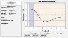 The sensor is connected to a laptop or tablet computer running ShuntCheck software. The sensor is connected to a laptop or tablet computer running ShuntCheck software. The computer analyzes the thermal data, determines “Flow Confirmed” or “Flow NOT Confirmed” and presents a time-temperature graph.