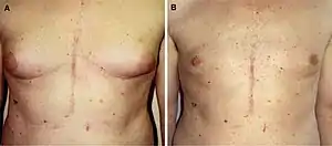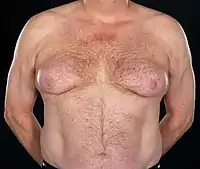 In more than 90% of affected men, bicalutamide-related breast changes are mild-to-moderate in severity.[9][35][34] It is only rarely and in severe and extreme cases of gynecomastia that the proportions of the male breasts become so marked that they are comparable to those of women.[36] In addition, bicalutamide-associated breast changes improve or resolve in most men upon discontinuation of therapy.[9] In the EPC trial, 16.8% of bicalutamide patients relative to 0.7% of controls withdrew from the study due to breast pain and/or gynecomastia.[35][34] Gynecomastia and breast pain improved or resolved upon discontinuation in 70 and 90% of patients, respectively.[34] Resolution of breast symptoms was dependent on duration of bicalutamide therapy, with resolution rates ranging from 29% with >18 months of treatment to 64% for <6 months of treatment.[34]