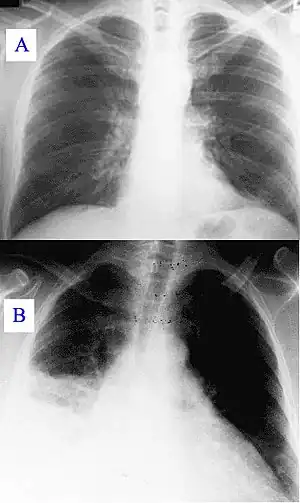 | A) Normal chest radiograph; B) Q fever pneumonia affecting the right lower and middle lobes. Note the loss of the normal radiographic silhouette (contour) between the affected lung and its right heart border as well as between the affected lung and its right diaphragm border. This phenomenon is called the silhouette sign | |