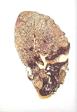 The name silicosis (from the Latin silex, or flint) was originally used in 1870 by Achille Visconti (1836–1911), prosector in the Ospedale Maggiore of Milan.[7] The recognition of respiratory problems from breathing in dust dates to ancient Greeks and Romans.[8] Agricola, in the mid-16th century, wrote about lung problems from dust inhalation in miners. In 1713, Bernardino Ramazzini noted asthmatic symptoms and sand-like substances in the lungs of stone cutters. Less than 10 years after its introduction, in 1720, as a raw material to the British ceramics industry the negative effects of milled calcined flint on the lungs of workers had been noted.[9] With industrialization, as opposed to hand tools, came increased production of dust. The pneumatic hammer drill was introduced in 1897 and sandblasting was introduced in about 1904,[10] both significantly contributing to the increased prevalence of silicosis. In 1938, the United States Department of Labor, led by then Secretary of Labor, Frances Perkins, produced a video titled 'Stop Silicosis' to discuss the results of a year-long study done concerning a rise in the number of silicosis cases across the United States.[11]