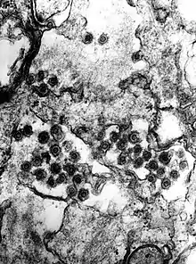Simian foamy virus (SFV) is a species of the genus Spumavirus that belongs to the family of Retroviridae. It has been identified in a wide variety of primates, including prosimians, New World and Old World monkeys, as well as apes, and each species has been shown to harbor a unique (species-specific) strain of SFV, including African green monkeys, baboons, macaques, and chimpanzees.[1] As it is related to the more well-known retrovirus human immunodeficiency virus (HIV), its discovery in primates has led to some speculation that HIV may have been spread to the human species in Africa through contact with blood from apes, monkeys, and other primates, most likely through bushmeat-hunting practices.