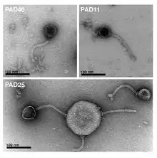 Electron micrographs of siphovirus from Cutibacterium acnes (formerly Propionibacterium acnes). Phages were negatively stained and subjected to transmission electron microscopy. The phages have a head of approximately 55 nm in diameter, loaded with genetic material. Their tails have a size of 150 × 10 nm and are flexible and non-contractile. In the lower micrograph, PAD25 is adhering to bacterial cell debris, and two phages have lost their heads. All phages were classified as Siphoviruses based on their morphology.[4]