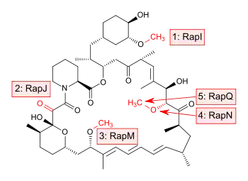 The core macrocycle, prerapamycin (figure 2), is then modified (figure 3) by an additional five enzymes, which lead to the final product, rapamycin. First, the core macrocycle is modified by RapI, SAM-dependent O-methyltransferase (MTase), which O-methylates at C39. Next, a carbonyl is installed at C9 by RapJ, a cytochrome P-450 monooxygenases (P-450). Then, RapM, another MTase, O-methylates at C16. Finally, RapN, another P-450, installs a hydroxyl at C27 immediately followed by O-methylation by Rap Q, a distinct MTase, at C27 to yield rapamycin.[49]