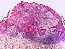 Small-cell melanoma, also known as melanoma with small nevus-like cells, is a cutaneous condition, a tumor that contains variably-sized, large nests of small melanocytes with hyperchromatic nuclei and prominent nucleoli.[1]