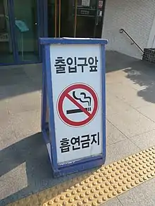 Since 1 January 2015, South Korea has completely banned smoking on all bars, restaurants and cafes regardless of size, including any smoking rooms. Any spotted smoker must pay fines of 100,000 won and up to 5 million won on shop owners not obeying the law.[23] Anyone can report a smoker via calling or sending a text message to a government hotline (in the case of Seoul, the number is 120) with their location address and authorities will raid the reported place, of which a picture of the offending smoker will be taken and fined 100,000 won. Disguised authorities also secretly check random places at random times for offending smokers. Furthermore, tobacco prices have nearly doubled to an average of ₩4,500 KRW, and it is illegal to advertise misleading claims such as "light", "mild", "low tar" or "pure" on cigarette packs.[24][25]
