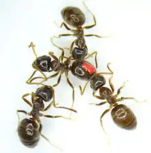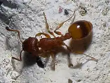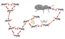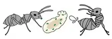 A giant ant (Camponotus gigas) carrying a dead conspecific - The corpses of group members killed by an infectious disease present a serious hazard to colony health (as in natural environments death from disease is much more common than death from old age): one mechanism that has evolved to help neutralize this risk is necrophoresis, the removal of corpses from the nest by workers.[21] 'Refuse piles' or 'graveyards' are common features of ant colonies, and workers remove corpses (within the hour after death) to these piles after detecting death signatures in the cuticular hydrocarbon chemistry.[22][23] Corpse deposition is biased towards downward slopes, which saves the corpse-transporting worker energy as well as preventing any rain washing the corpses back into the colony - necrophoretic behaviours are distinct from ant responses to foreign inanimate objects as corpses are transported further and quicker.[22][24] By bringing corpses out of the nest the ultraviolet radiation in sunlight can kill emerging fungal spores;[24] Atta transport corpses to special refuse chambers rather than into the external environment. Temnothorax lichtensteini ants remove the corpses of dead sisters as above, but bury newly-dead foreign corpses inside the nest - whilst one or a few individuals 'decide' to transport or bury a corpse, up to 25 workers are then involved in the undertaking of one corpse.[25] Termites commonly bury and cannabalize corpses:[24] when C. formosanus colonies are infected with M. anisopliae, necrophagy is common when the proportion of dead individuals in an area was low (15%), but as mortality increased then so did burying behaviour up to 75%–80% mortality above which carcasses were too numerous for workers to bury and secondary rounds of M. anisopliae infection was possible.[26] Termites do occasionally remove dead from the nest but this is uncommon (leaving the nest at all is rare); refuse chambers or piles/graveyards have not been observed.[24] Research on undertaking behaviours in bees has concentrated on the honeybee (Apis mellifera): 1–2% of a colony are undertaker bees, specialized for corpse removal: they inspect corpses with their antennae before rapidly dropping them from the nest.[24][27]
