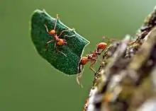 - Workers of the tropical leafcutter ant bringing leaf fragments back to the nest are at risk of attack by parasitiodic phorid flies, who often land on leaf fragments and then proceed to oviposit (egg-lay) into the ant's head.[9] To help combat this, small workers (minims) in at least seven species of Atta hitchhike on the leaves, deterring parasitoid attack.[6] Many possible additional functions of hitchhiking have been proposed, some pertinent to social immunity; evidence exists that the primary function of hitchhiking minims' is actually to inspect and clean the leaf fragments prior to their entry into the colony, removing microbial parasites and contaminants.[6]
