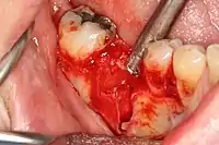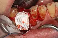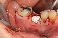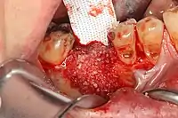 Socket preservation or alveolar ridge preservation is a procedure to reduce bone loss after tooth extraction.[1][2] After tooth extraction, the jaw bone has a natural tendency to become narrow, and lose its original shape because the bone quickly resorbs, resulting in 30–60% loss in bone volume in the first six months.[3] Bone loss, can compromise the ability to place a dental implant (to replace the tooth), or its aesthetics and functional ability.