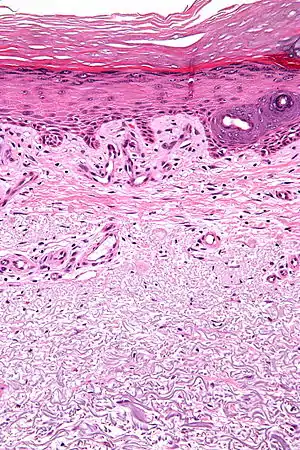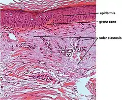 | Micrograph showing solar elastosis - grey, jumbled spaghetti-like material on bottom of image. H&E stain. | |