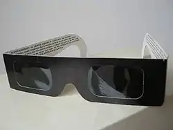 Solar viewer (also known as solar viewing glasses or solar eclipse glasses) are special eyewear designed for direct viewing of the Sun. Standard sunglasses are unable to filter out eye damaging radiation. Solar viewers are required for safe viewing of solar events such as eclipses. The recommended optical density of this eyewear is 5.