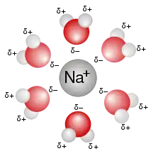 A classic example is when water molecules arrange around a metal ion. If the metal ion is a cation, the electronegative oxygen atom of the water molecule would be attracted electrostatically to the positive charge on the metal ion. The result is a solvation shell of water molecules that surround the ion. This shell can be several molecules thick, dependent upon the charge of the ion, its distribution and spatial dimensions.