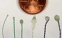 Sonomicrometry is a technique of measuring the distance between piezoelectric crystals based on the speed of acoustic signals through the medium they are embedded in. Typically, the crystals will be coated with an epoxy 'lens' and placed into the material facing each other. An electrical signal sent to either crystal will be transformed into sound, which passes through the medium, eventually reaching the other crystal, which converts the sound into electricity, detected by a receiver. From the time taken for sound to move between the crystals and the speed of sound in the medium, the distance between the crystals can be calculated.