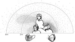 Coughs and sneezes can spread airborne droplets up to ~8 meters (26 ft). Speaking can spread droplets up to ~2 meters (6.6 ft).[6] It may be difficult to maintain these distances. For a masked person, or even one sneezing or coughing into a tissue or elbow, these distances are reduced.[8]