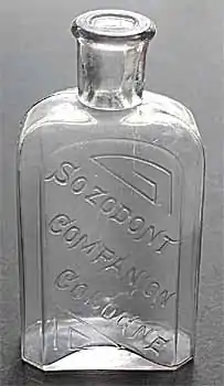 Created in 1859 by druggist Roswell van Buskirk (circa 1824–1902) of New Jersey,[1] it derived its name from the Greek sozo, meaning "to save", and dontia, meaning "teeth". Sozodont was later manufactured by the firm Hall & Ruckel of New York, New York, and London, England. Known as Van Buskirk's Fragrant Sozodont, or Van Buskirk's Fragrant and Antiseptic Sozodont, the product was dispensed from a glass bottle through a metal sprinkler and, as illustrated advertisements show, could be applied to the teeth using a toothbrush. The product made strong use of advertising as a marketing tool and by the late nineteenth century was an established household word.