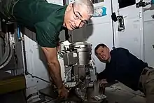 On May 21, 2008, the gas–liquid separator pump failed on the 7-year-old toilet in Zvezda, although the solid-waste portion was still functioning. The crew attempted to replace various parts, but was unable to repair the malfunctioning part. In the interim, they used a manual mode for urine collection.[10] The crew had other options: to use the toilet on the Soyuz transport module (which only has capacity for a few days of use) or to use urine-collection bags as needed.[11] A replacement pump was sent from Russia in a diplomatic pouch, so that Space Shuttle Discovery could take it to the station as part of mission STS-124 on June 2.[12][13][14]