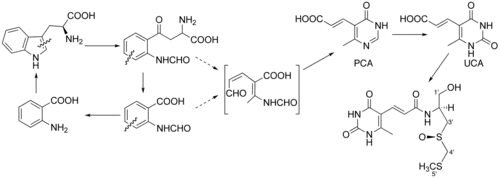 Study of the biosynthesis of the sparsomycin in a greater detail has revealed that L-cysteine and S-methyl group of methionine are real precursors for the monooxo-dithioacetal group.[8] These studies have also confirmed the L-tryptophan being a predecessor of the uracil moiety of the sparsomycin. However, it still remained unclear whether the transformation proceeds through the kynureine pathway or not. The next paper published by the same research group has shown that this pathway is not responsible for the transformations of L-tryphophan in the biosynthesis of sparsomycin. In this paper the authors have also confirmed (E)-3-(4-oxo-6-methyl-5-pyrimidinyl)acrylic acid (PCA) and (E)3-(2,4-dioxo-6-methyl-5-pyrimidinyl)acrylic acid (UCA) being intermediates in the studied biosynthetic pathway.[9] Several years later an enzyme, which catalyzes transformation of PCA to UCA was found.[10]