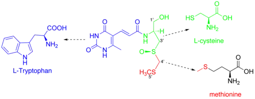 Although the structure of sparsomycin was published in 1970, no biosynthetic pathway for its formation was proposed in the literature up until 1988. Ronald J. Parry et al. have investigated biosynthetical precursors for the unusual monooxo-dithioacetal group.[7] By administering the radioactively labeled L-methionine to S. sparsogenes, they figured out that it was the most probable precursor for C-4' and C-5' atoms of the sparsomycin. However, when administering labeled cysteine, they found that C-4' did not contain any 13C while C-3' still did. This finding led them to an assumption that an enzyme called serine transhydroxymethylase could be responsible for the observation by conversion of the cysteine to serine residue. However, this assumption was not confirmed, as administration of 13C-serine did not produce any labeled sparsomycin. In this study the authors have finally concluded that S-methyl-D-cysteine should be the precursor for this part of the molecule. In this paper they have also proposed a L-tryptophan as a source of the uracil-containing part of the molecule.