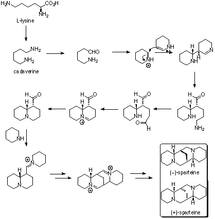 Sparteine is a lupin alkaloid containing a tetracyclic bis-quinolizidine ring system derived from three C5 chains of lysine, or more specifically, L-lysine.[1] The first intermediate in the biosynthesis is cadaverine, the decarboxylation product of lysine catalyzed by the enzyme lysine decarboxylase (LDC).[2] Three units of cadaverine are used to form the quinolizidine skeleton. The mechanism of formation has been studied enzymatically, as well as with tracer experiments, but the exact route of synthesis still remains unclear.