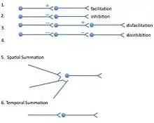 Spatial summation is a mechanism of eliciting an action potential in a neuron with input from multiple presynaptic cells. It is the algebraic summing of potentials from different areas of input, usually on the dendrites. Summation of excitatory postsynaptic potentials increases the probability that the potential will reach the threshold potential and generate an action potential, whereas summation of inhibitory postsynaptic potentials can prevent the cell from achieving an action potential. The closer the dendritic input is to the axon hillock, the more the potential will influence the probability of the firing of an action potential in the postsynaptic cell.[6]