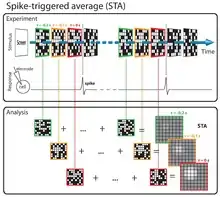 Mathematically, the STA is the average stimulus preceding a spike.[1][2][3][4] To compute the STA, the stimulus in the time window preceding each spike is extracted, and the resulting (spike-triggered) stimuli are averaged (see diagram). The STA provides an unbiased estimate of a neuron's receptive field only if the stimulus distribution is spherically symmetric (e.g., Gaussian white noise).[3][5][6]