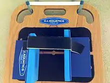 A spinal board,[4] is a patient handling device used primarily in pre-hospital trauma care. It is designed to provide rigid support during movement of a person with suspected spinal or limb injuries.[5] They are most commonly used by ambulance staff, as well as lifeguards and ski patrollers.[2][6] Historically, backboards were also used in an attempt to "improve the posture" of young people, especially girls.[7]