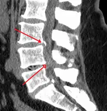 Causes may include osteoarthritis, rheumatoid arthritis, spinal tumors, trauma, Paget's disease of the bone, scoliosis, spondylolisthesis, and the genetic condition achondroplasia.[3] It can be classified by the part of the spine affected into cervical, thoracic, and lumbar stenosis.[2] Lumbar stenosis is the most common, followed by cervical stenosis.[2] Diagnosis is generally based on symptoms and medical imaging.[4]