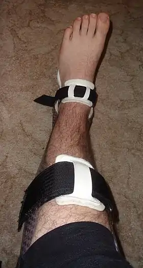 ![]() An ankle foot orthosis (AFO), a type of splint used to support the foot and ankle. | |