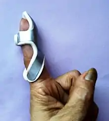 - Finger splints – Used for the fingers. A "mallet" or baseball finger is a rupture of the extensor tendon and sometimes including a fracture. While surgery may be necessary such an injury may heal if placed in a finger splint.[3]