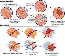 SCAD symptoms are the result of a restriction in the size of the lumen of the affected coronary artery. A bleed within the wall of the artery (tunica intima) originating from the microvessels that perfuse this muscular layer (vasa vasorum) leads to a collection of blood, or hematoma, between the layers of the artery wall.[1] The hematoma pushes close the lumen, preventing blood from flowing to the heart muscle (myocardium). In some cases (~30%) this hematoma (also referred to as an intramural hematoma) is also accompanied by a tear in the inner most layer of the artery - a monolayer of endothelial cells called the tunica intima. It is not clear if this precedes or follows a bleed within the wall of the artery.[10] The tracking of blood within the artery wall (both in the presence or absence of an intimal tear) is referred to as a "false lumen".[11][12][13] The restriction of blood flow in the 'true' lumen limits the availability of oxygen and nutrients to the heart muscle, or myocardium. As a result, the myocardium continues to demand oxygen but is not adequately supplied by the coronary artery. This imbalance leads to ischemia, damage, and in some cases can lead to death of the myocardium tissue, causing a heart attack (myocardial infarction).