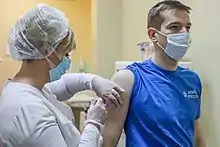 The first dose (based on Ad26) is administered on the first day, and the second dose (based on Ad5) is administered on the 21st day to boost immune response.[19][20][21] Both doses are administered into the deltoid muscle.