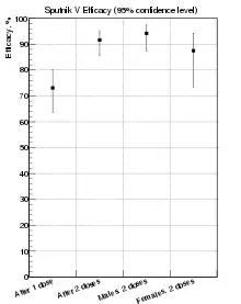 The vaccine efficacy of a COVID-19 vaccine or any other vaccine is evaluated in controlled clinical trials. It is an estimate of how many people who received the vaccine got the disease compared to how many people who got a placebo had the same outcome. On 2 February 2021, an interim analysis from the Moscow trial was published in The Lancet reporting an efficacy of 91.6% (95% CI, 85.6–95.2%) after the second dose for all age groups, with no unusual side effects.[33] For the age group of 60 years and older, the reported efficacy was 91.8%.[34] On 12 May, a group of biostatisticians from Russia, the US, France, Italy and the Netherlands questioned the efficacy results in a correspondence in The Lancet, highlighting data discrepancies