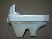 A squat toilet (or squatting toilet) is a toilet used by squatting, rather than sitting. This means that the posture for defecation and for female urination is to place one foot on each side of the toilet drain or hole and to squat over it. There are several types of squat toilets, but they all consist essentially of a toilet pan or bowl at floor level. Such a toilet pan is also called a "squatting pan". A squat toilet may use a water seal and therefore be a flush toilet, or it can be without a water seal and therefore be a dry toilet. The term "squat" refers only to the expected defecation posture and not any other aspects of toilet technology, such as whether it is water flushed or not.