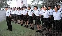 Cadet members are presently only entitled to wear the Ceremonial and Field Uniform, the latter of which is also the most widely recognised uniform of the St. John Brigade Singapore. The Field Uniform consists of a black beret with a cap badge, depending on which is entitled to the wearer. Nursing members wear a hairnet as well. The top consists of a white short-sleeved shirt / blouse with plastic concealed buttons. For female members, due to the white uniform, bras should be of decent colours if worn. Shoulder flashes bearing the Maltese Cross with twin lions and unicorns, together with the words "St. John Singapore" are worn on both sleeves. A black epaulette is worn on both shoulders denoting the rank of the member. The bottom consists of black pants / culottes, which is worn with the St. John belt. Black socks and black low-cut boots are worn with the shoelaces tied in the formal-style.
