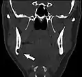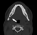 Stafne's defect is usually discovered by chance during routine dental radiography.[11] Radiographically, it is a well-circumscribed, monolocular, round, radiolucent defect, 1–3 cm in size, usually between the inferior alveolar nerve (IAN) and the inferior border of the posterior mandible between the molars and the angle of the jaw. It is one of the few radiolucent lesions that can occur below the IAN. The border is well corticated and it will have no effect on the surrounding structures. Computed tomography (CT) will show a shallow defect through the medial cortex of the mandible with a corticated rim and no soft tissue abnormalities, with the exception of a portion of the submandibular gland. Neoplasms, such as metastatic squamous cell carcinoma to the submandibular lymph nodes or a salivary gland tumour, could create a similar appearance but rarely have such well defined borders and can usually be palpated in the floor of the mouth or submandibular triangle of the neck as a hard mass. CT and clinical exam is typically sufficient to distinguish between this and a Stafne defect. The Stafne defect also tends to not increase in size or change in radiographic appearance over time (hence the term "static bone cyst"), and this can be used to help confirm the diagnosis.[11] Tissue biopsy is not usually indicated, but if carried out, the histopathologic appearance is usually normal salivary gland tissue. Sometimes attempted biopsy of Stafne defects reveals an empty cavity (possibly because the gland was displaced at the time of biopsy), or other contents such as blood vessels, fat, lymphoid or connective tissues. Defects of the anterior lingual mandible may require biopsy for correct diagnosis at this unusual location.[5] The radiolucent defect here may be superimposed on the lower anterior teeth and be mistaken for an odontogenic lesion. Sometimes the defect may interrupt the contour of the lower border of the mandible, and may be palpable. Sialography may be sometimes used to help demonstrate the salivary gland tissue within the bone.