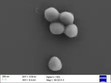 Staphylococcus haemolyticus is a member of the coagulase-negative staphylococci (CoNS).[2] It is part of the skin flora of humans,[3] and its largest populations are usually found at the axillae, perineum, and inguinal areas.[4] S. haemolyticus also colonizes primates and domestic animals.[4] It is a well-known opportunistic pathogen, and is the second-most frequently isolated CoNS (S. epidermidis is the first).[5] Infections can be localized or systemic, and are often associated with the insertion of medical devices.[6][7][8] The highly antibiotic-resistant phenotype and ability to form biofilms make S. haemolyticus a difficult pathogen to treat.[5] Its most closely-related species is Staphylococcus borealis.[9]