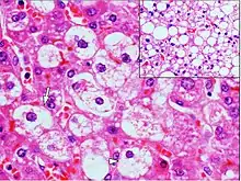 Microvesicular steatosis is characterized by small intracytoplasmic fat vacuoles (liposomes) which accumulate within hepatocytes.[9] Common causes are tetracyclines, acute fatty liver of pregnancy, Reye's syndrome, and hepatitis C.