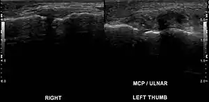 A Stener lesion is a type of traumatic injury to the thumb. It occurs when the aponeurosis of the adductor pollicis muscle becomes interposed between the ruptured ulnar collateral ligament (UCL) of the thumb and its site of insertion at the base of the proximal phalanx. No longer in contact with its insertion site, the UCL cannot spontaneously heal.[1]