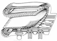 Line drawing of oral and somatic cytoskeletal elements of Stephanopogon apogon showing, to the left, the opening of the mouth, and extending from it lines of flaglla that are attached to long strips of cytoskeletal material, and are anchored to the cell surface by cones of microtubules. Small sac-like organelles are associated with the oral region of the cell.